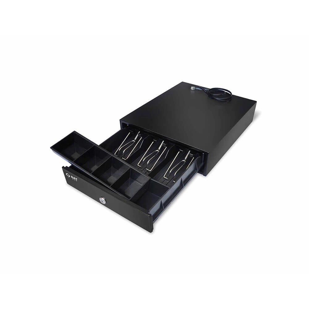 El SAT RS100 es un cajón monedero compacto y resistente, ideal para puntos de venta. Ofrece: