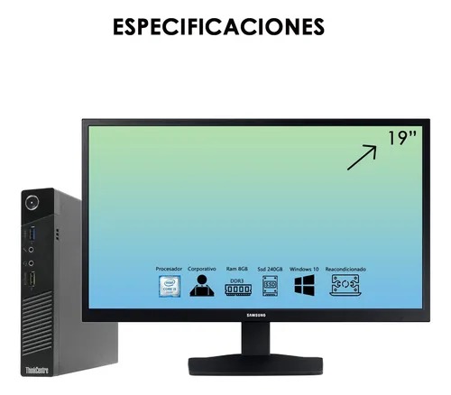 El formato Tiny (ultracompacto) permite ahorrar espacio sin comprometer funcionalidad. El kit incluye un monitor de 19 pulgadas, ideal para trabajo cómodo en escritorio, además de un combo inalámbrico de teclado y mouse, que ofrece libertad de movimiento y un área de trabajo más limpia.